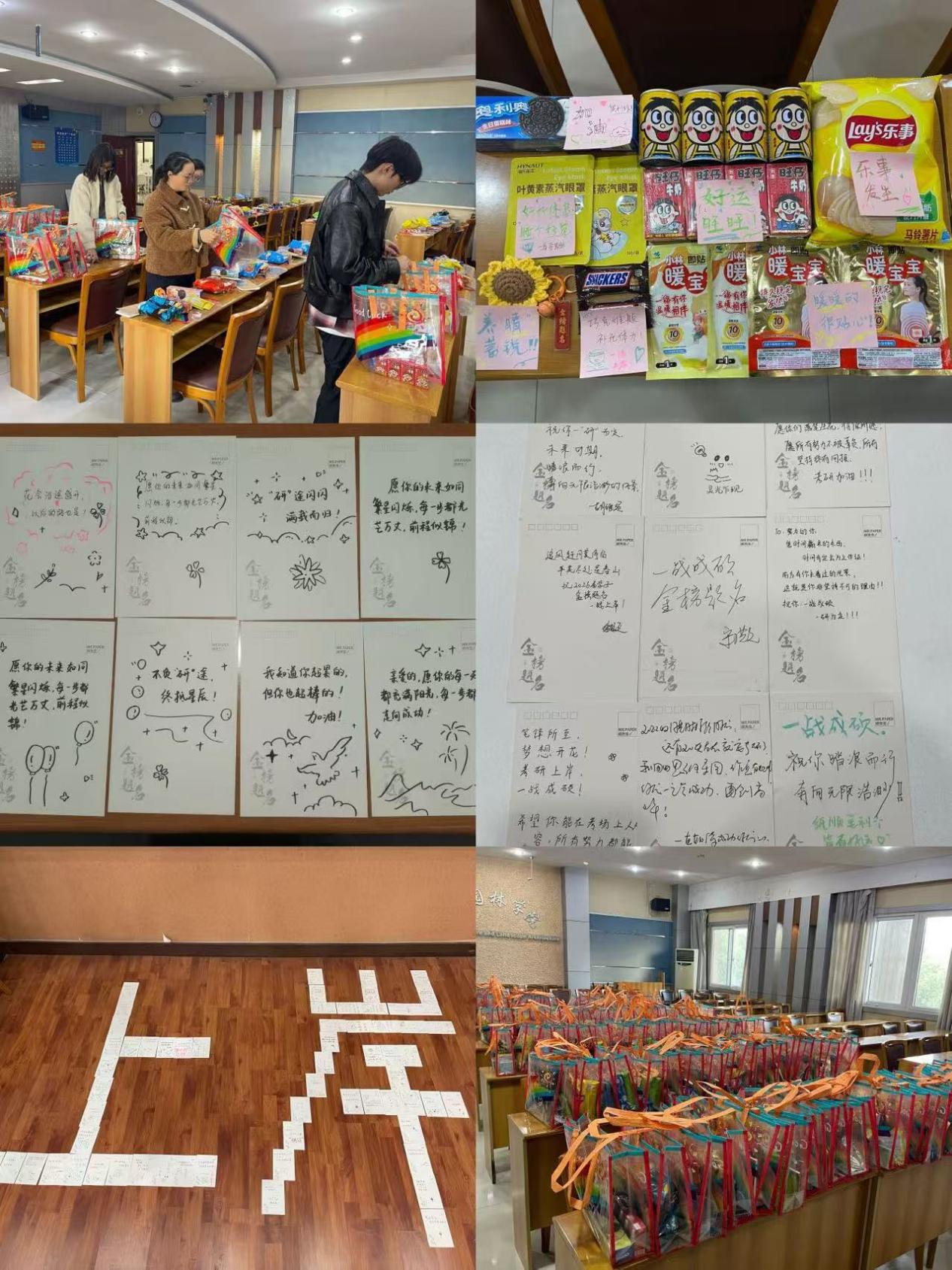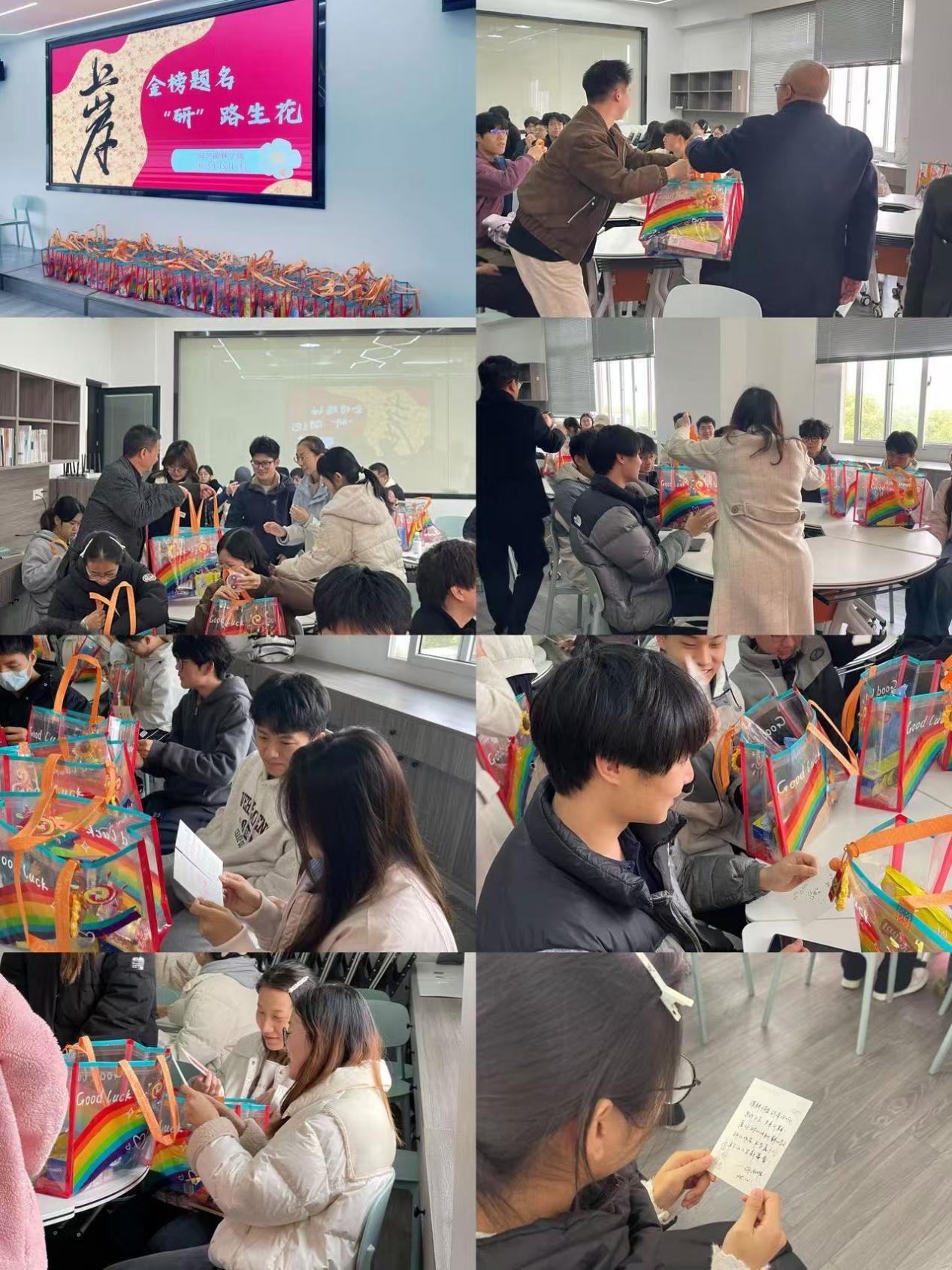 活动伊始,现场洋溢着温馨暖心的氛围学院精心准备的“考研暖心大礼包”整齐摆放,每一份都蕴藏美好寓意:“好运旺旺”“乐事发生”“养‘晴’蓄锐”“巧克难题”......礼包中还附有学院领导、老师和同学们亲笔书写的明信片,字里行间满载对考研学子的深情鼓励与殷切期盼。