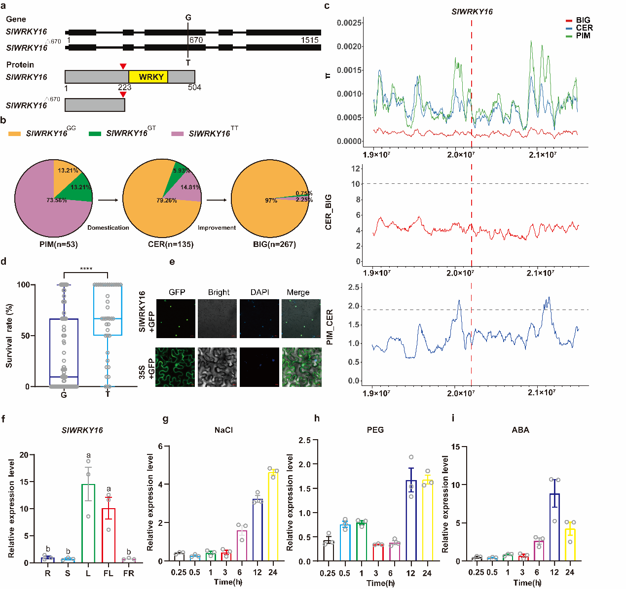 本研究基于455份番茄种质资源的全基因组SNP数据,鉴定到SlWRKY16基因区域一个显著关联干旱耐性的关键SNP(SNP670,G→T),该突变引入提前终止密码子,产生截短型SlWRKY16蛋白。群体遗传分析表明,该突变在野生番茄中高频存在,而在栽培番茄中显著降低,并与抗旱性状显著相关。