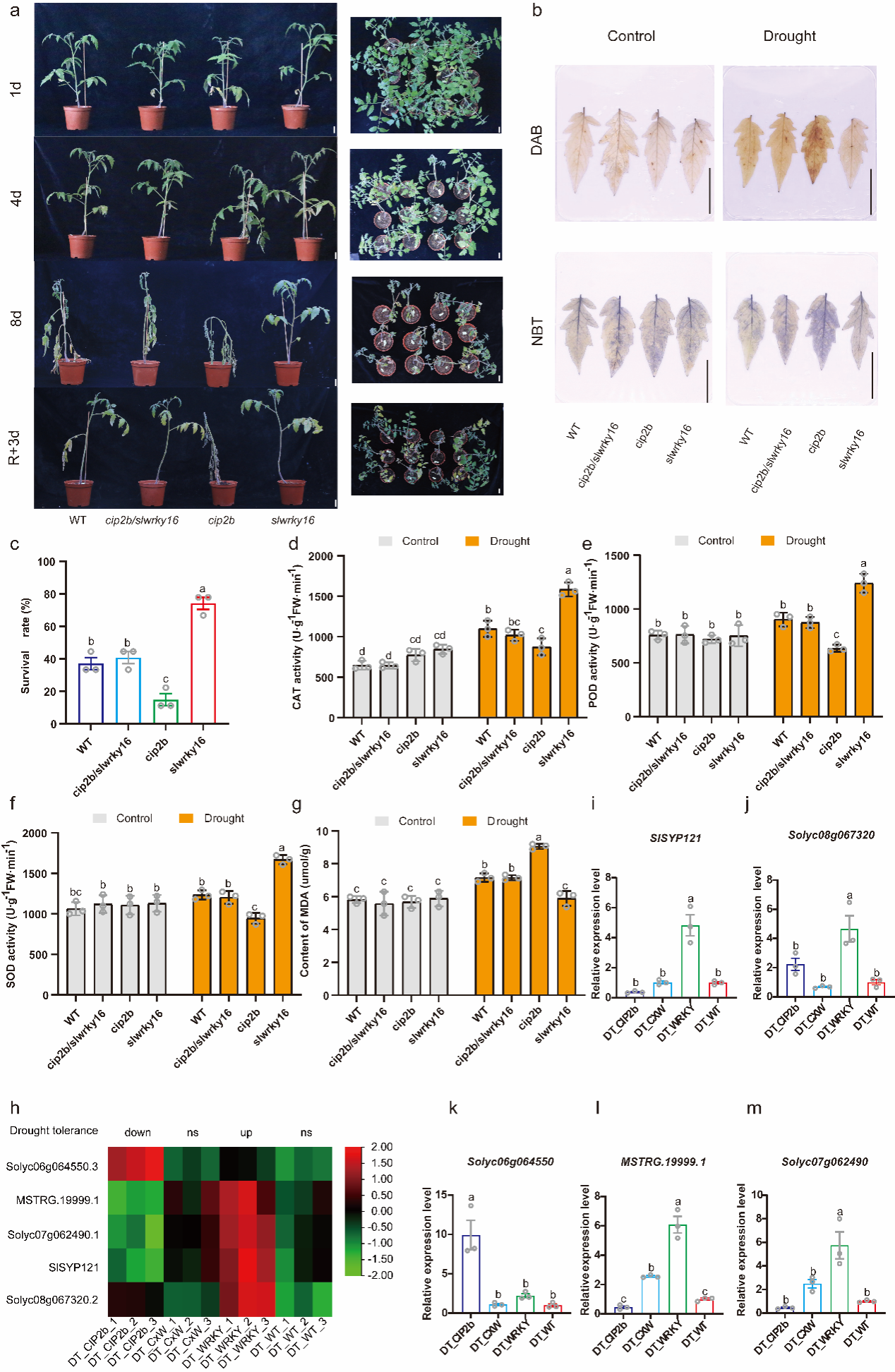 为进一步解析SlWRKY16与CIP2b之间的遗传关系,研究团队构建了cip2b/slwrky16双突变体,并系统比较其在干旱条件下的表型表现与生理指标变化。结果显示,与cip2b单突变体相比,双突变体的干旱敏感性明显缓解,植株存活率显著提高, ROS积累水平下降,抗氧化酶活性部分恢复至野生型水平。遗传互作分析表明,SlWRKY16的缺失能够部分弥补cip2b突变所造成的抗旱缺陷,证明二者位于同一调控通路中,并在功能上形成拮抗调控关系。
