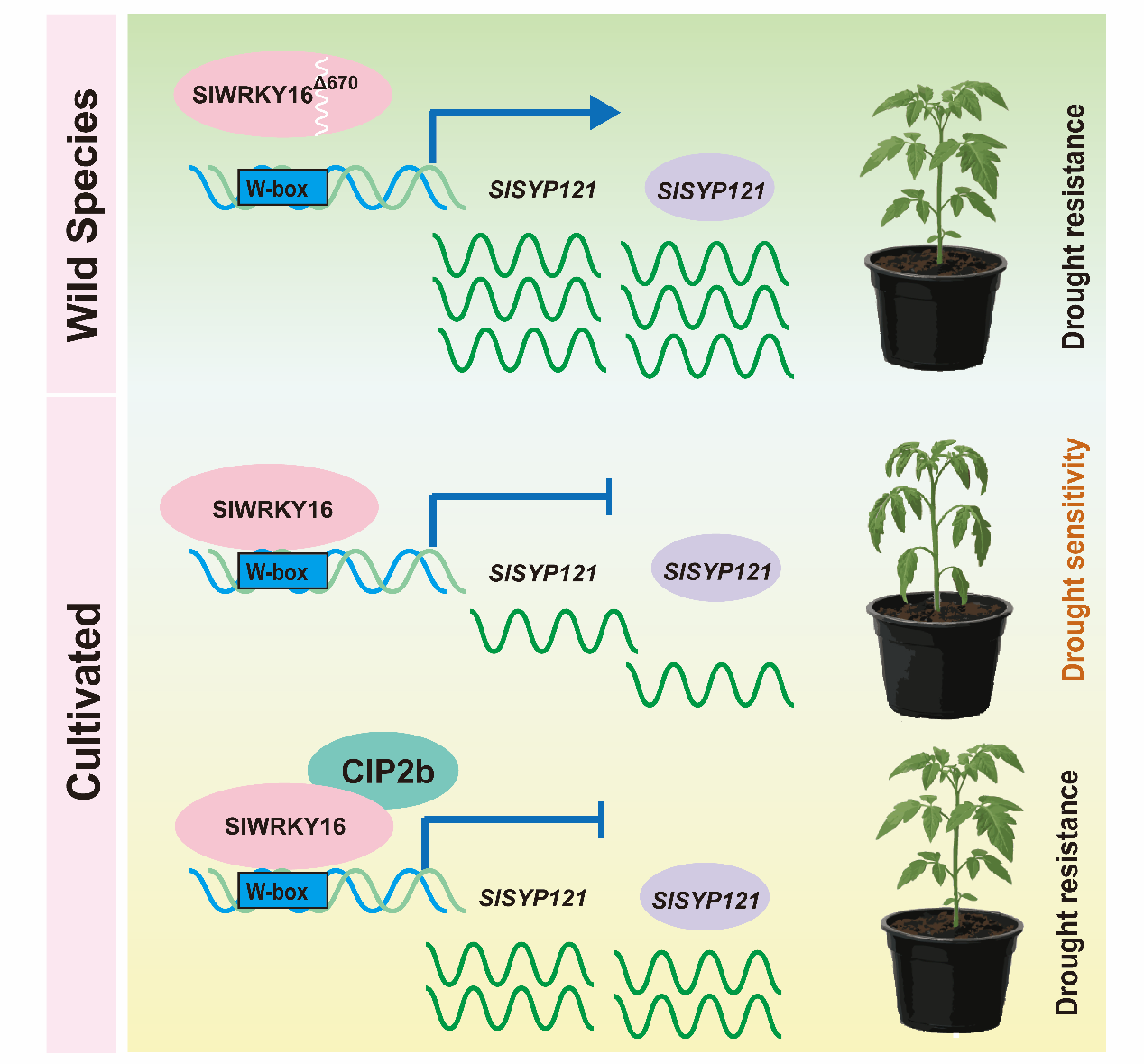 综上,该研究构建了“SlWRKY16–CIP2b–SlSYP121”干旱响应调控模型,揭示了天然SNP通过影响WRKY16蛋白功能进而调控ROS清除能力、增强番茄抗旱性的分子机制。该成果为番茄抗旱分子设计育种提供了新的基因资源和理论依据。